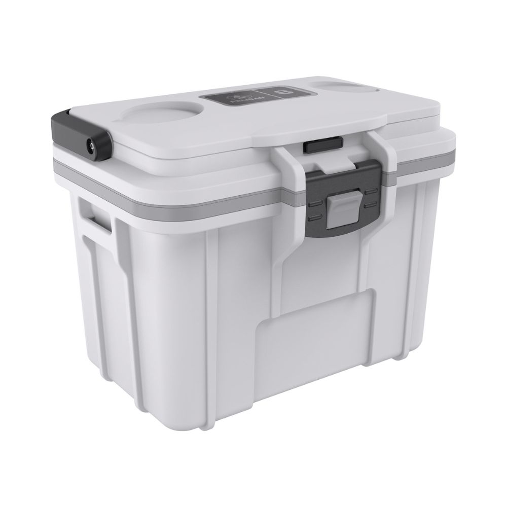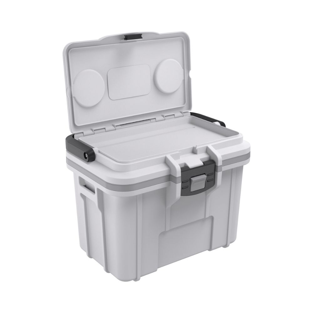 Dentro de la tapa del cooler hay un área de almacenamiento seco para llaves, teléfonos o billeteras, y en la parte superior de la tapa hay portavasos integrados. El resistente cooler también cuenta con un exclusivo cierre Press & Pull™ para facilitar la apertura y el cierre, y un asa plegable para facilitar el transporte.