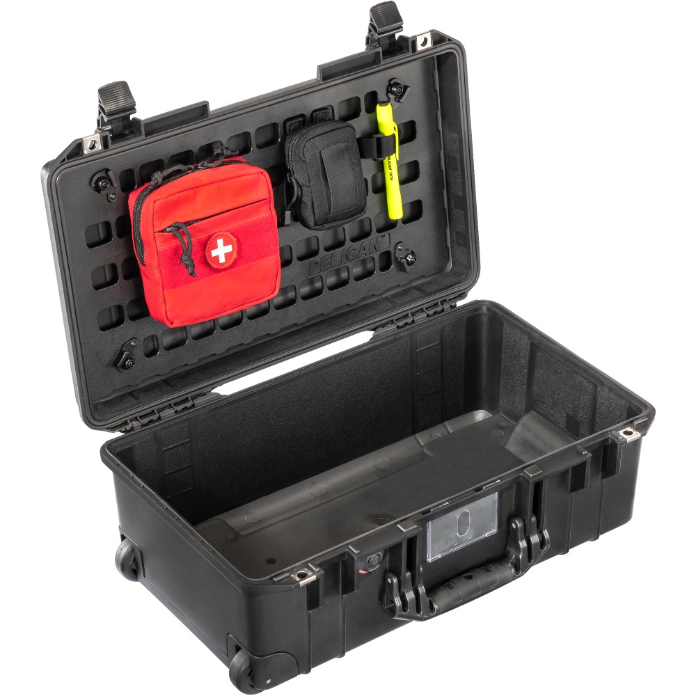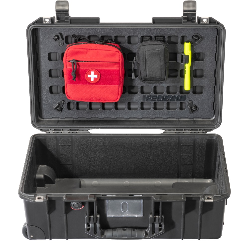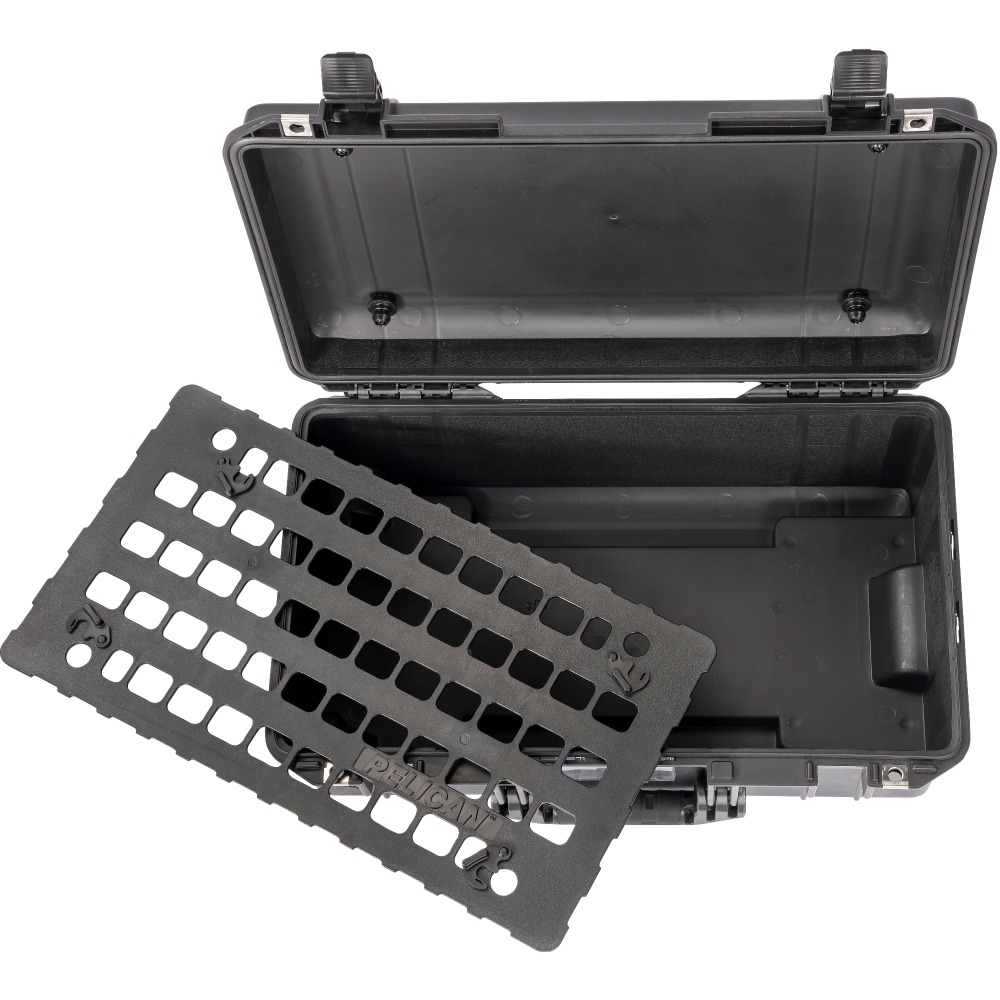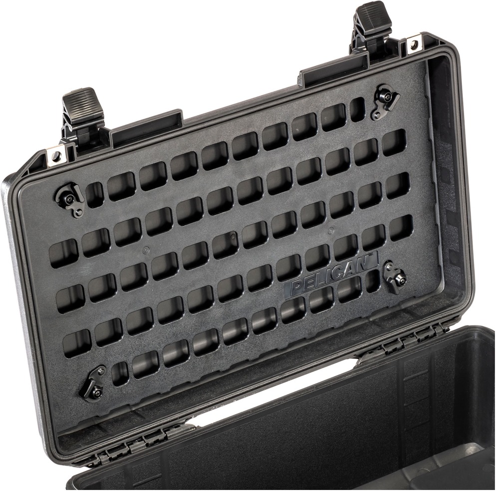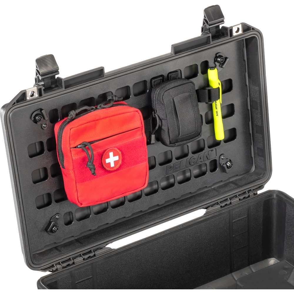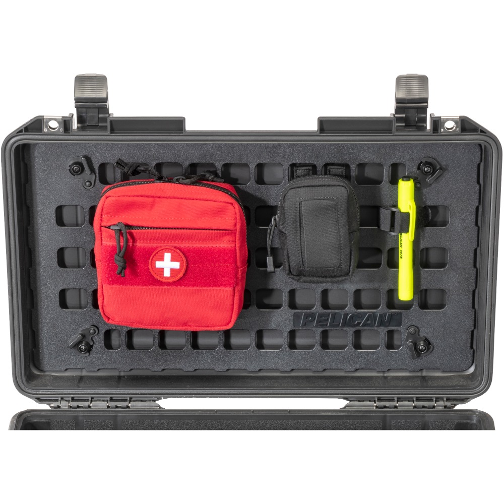 Nuestro exclusivo panel Pelican™ EZ-Click™ MOLLE es un sistema organizador de tapa, es un panel duradero que utiliza cierres giratorios para desprenderse de su estuche Pelican™ para un cambio rápido. Ahora puede adjuntar una combinación ilimitada de bolsas MOLLE proporcionadas por el cliente y tiras de Velcro™ en la parte interna de la tapa del estuche. Con paneles adicionales, incluso puede preconfigurar su equipo para cada trabajo o aventura.