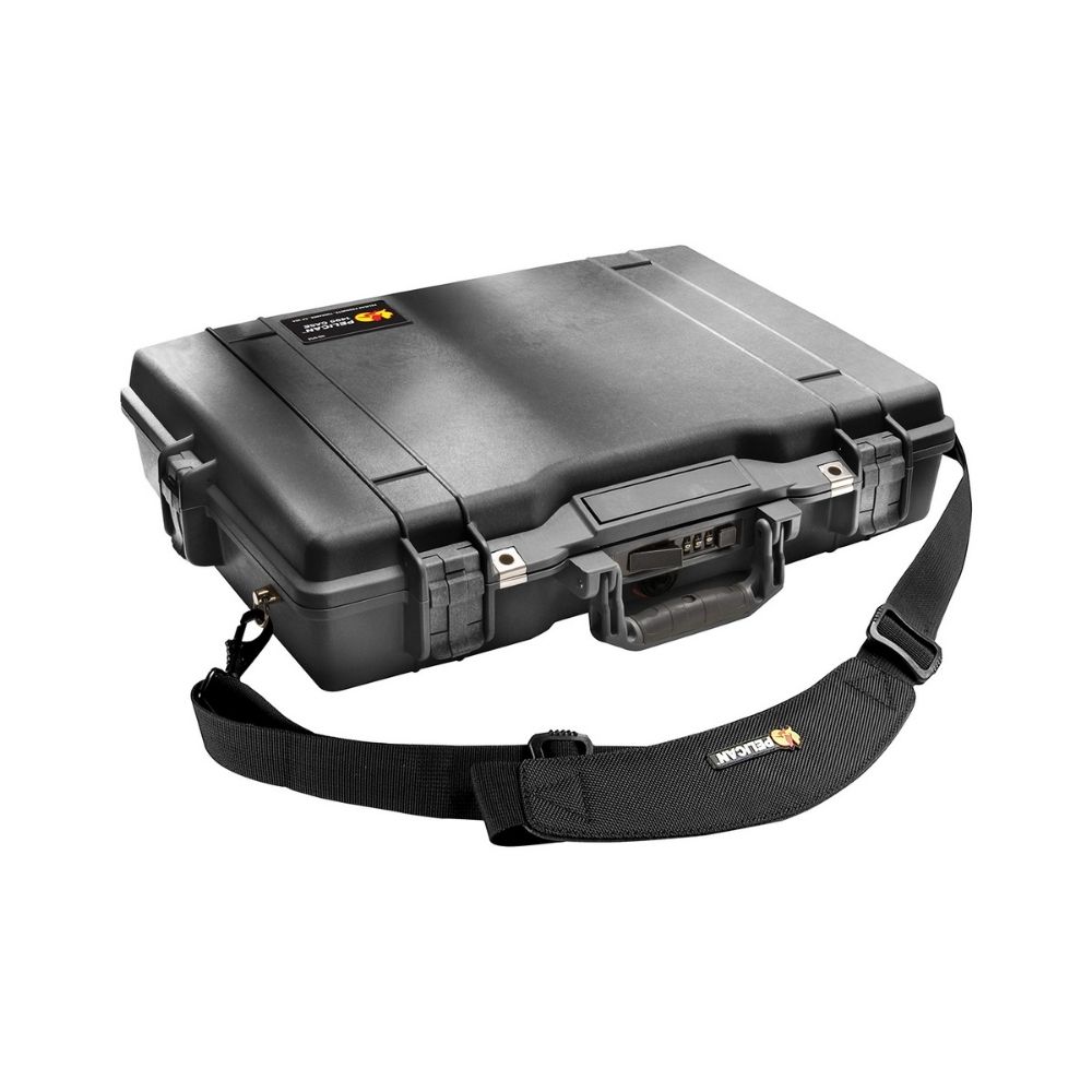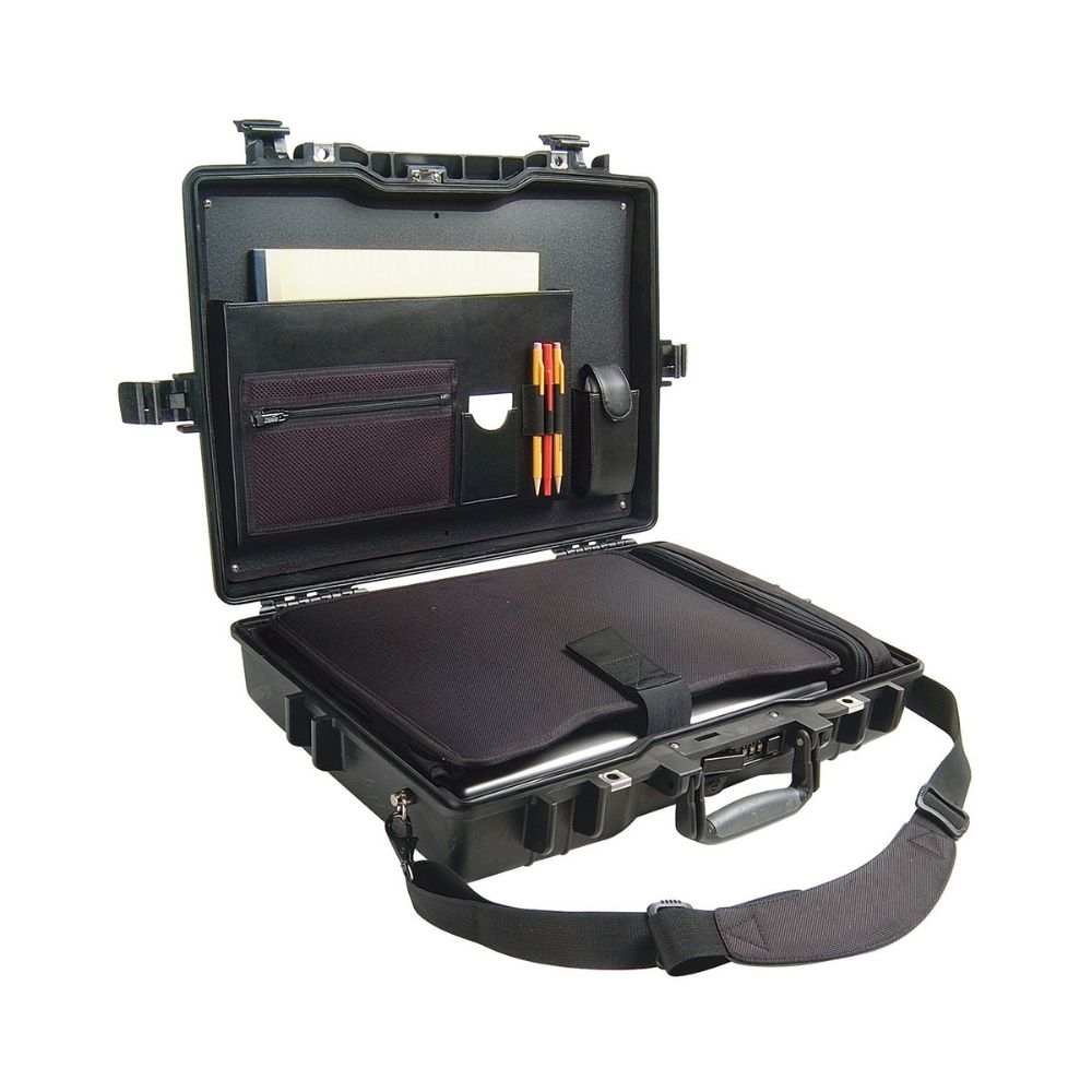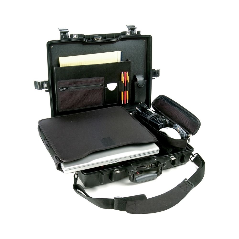 Organizador en la tapa, bandeja absorbente de impactos y correa de hombro acolchada.